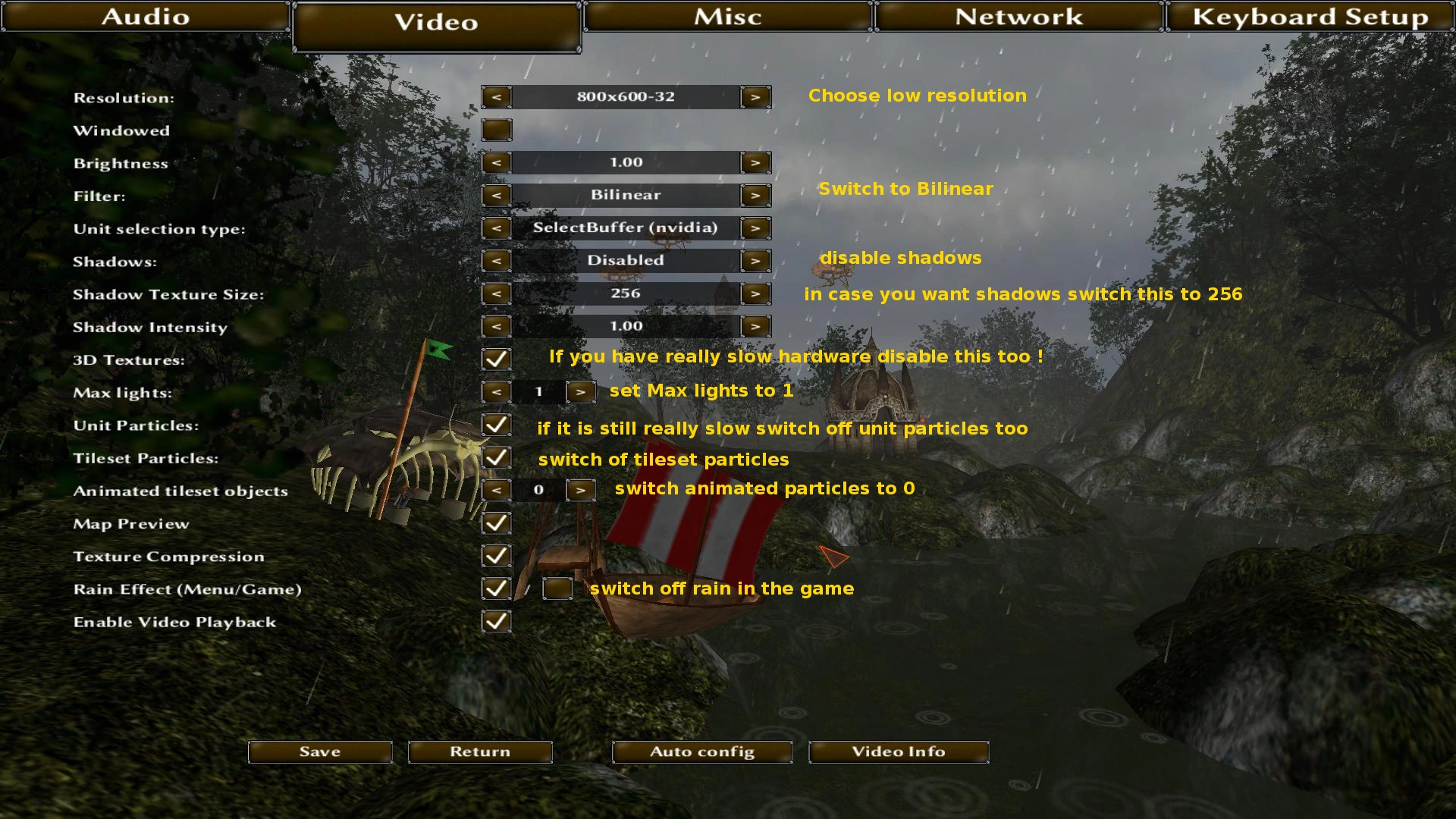 AnimatedTilesetObjects=0 ColorBits=8 DepthBits=16 EnableVideos=0 FactionPreview=0 FactorySound=None Filter=Bilinear FilterMaxAnisotropy=1 FogOfWarSmoothing=false FogOfWarSmoothingFrameSkip=5 GammaValue=1.000000 MapPreview=0 MaxLights=0 No2DMouseRendering=1 RainEffect=0 RainEffectMenu=0 ScreenHeight=600 ScreenWidth=800 Shadows=Disabled ShadowTextureSize=256 ShadowIntensity=1.000000 StencilBits=0 Textures3D=false TilesetParticles=0 TimeDisplay=0 UnitParticles=false Windowed=0